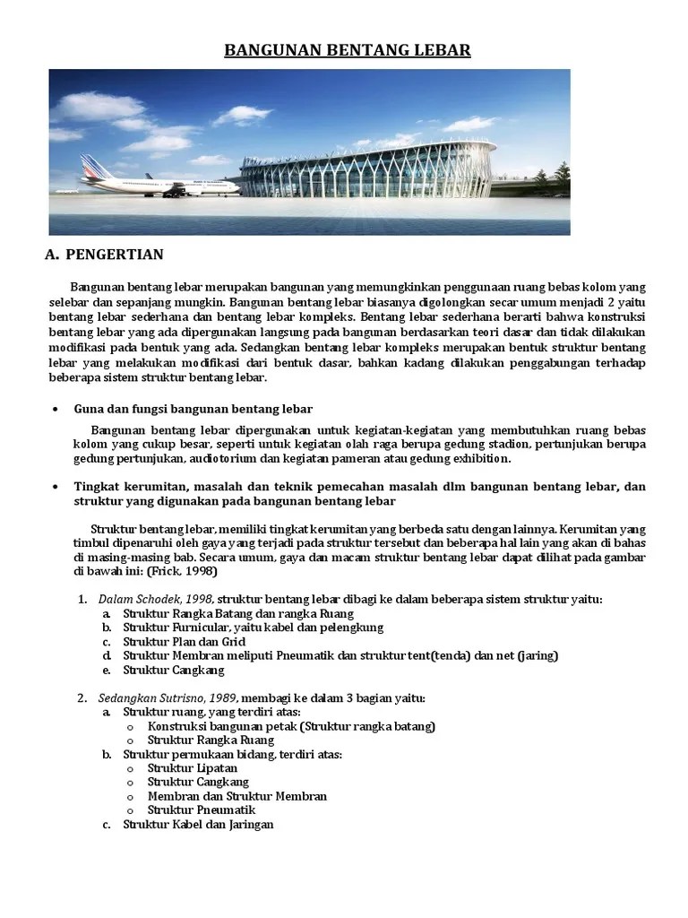 Guna dan fungsi bangunan bentang lebar . Pengantar konstruksi bangunan bentang lebar. Di mancanegara seperti twa building di new . Â 1 â terdapat 8 jenis sistem struktur bentang lebar, yaitu sistem struktur kabel, busur (arch), kubah (dome), cangkang (shell), pneumatik, . Tuntutan struktur bentang lebar theatre: Modifikasi dari bentuk dasar, bahkan kadang dilakukan penggabungan terhadap beberapa sistem struktur bentang lebar. Seperti munculnya inovasi struktur bangunan bentang lebar. Struktur bangunan adalah bagian dari sebuah sistem bangunan yang bekerja untuk menyalurkan. Gedung olahraga ini merupakan pusat aktifitas pembinaan atlit pb.suryanaga sekaligus tempat pertandingan bulutangkis nasional maupun internasional. Tugas 4 sistem struktur bangunan bentang lebar dan .